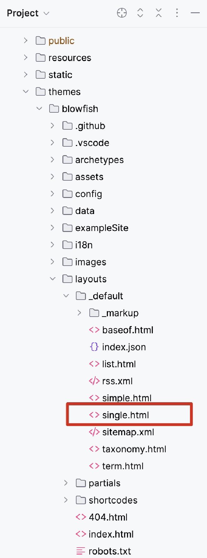 首先,Blowfish提供了好几种不同布局的页面,具体请看官方文档中的内容示例部分。在自定义某个页面时,自己心里可能也已经对想要什么布局心里有个概念,比如我想它继承Blowfish的样式,带有顶部和底部导航栏,那么符合我要求的就是「叶子页面」,从Blowfish主题代码目录下的layouts/_default/single.html可以找到它的代码(如图)。